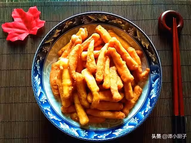 1.取正宗的北方老豆腐一塊,改刀切成厚薄均勻的長方塊,放到盤子裡等待小譚的召喚。