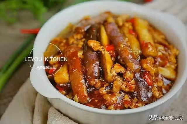 第一步:準備食材。長茄子2根、肉末60克、蒜適量。(茄子最好選擇細長,切開後沒有籽的嫩茄子。)