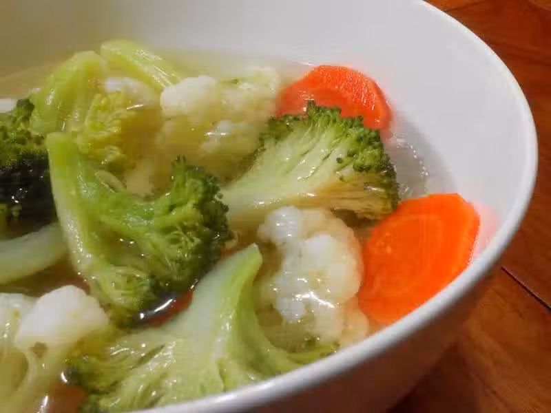 接著放入雙花椰菜、胡蘿蔔川燙,加入少許鹽巴、糖、胡椒粉、香油,即可享用清淡、健康、美味可口的佳餚-雙花椰菜胡蘿蔔湯。
