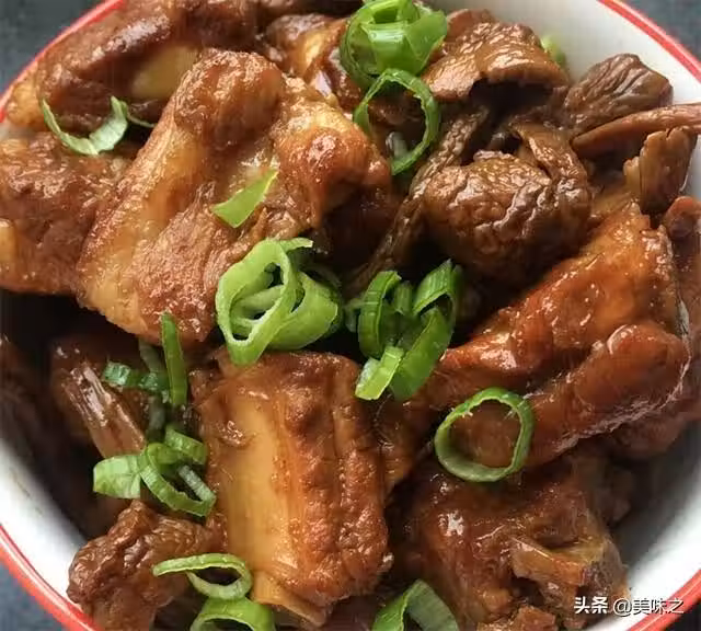 排骨500克、姬松茸50克、清水若干、食用油半湯匙、滷肉料小許、蔥適量、食鹽1克、老抽15克、生抽5克、冰糖幾塊、雞精1克、姜適量。