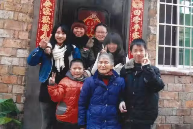 △唐才英老人和家中小孩子的合影(右一為張佳港)