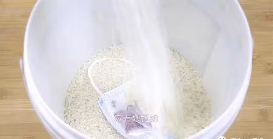 接下來,我們只需要把它埋進大米裡面就可以了,要是大米比較多的話,我們也可以多製作上幾個,在大米的底部、中間、表面各放上一個。花椒和干辣椒散發出來的刺激性氣味,就能有效的預防大米生蟲,方法簡單有效。