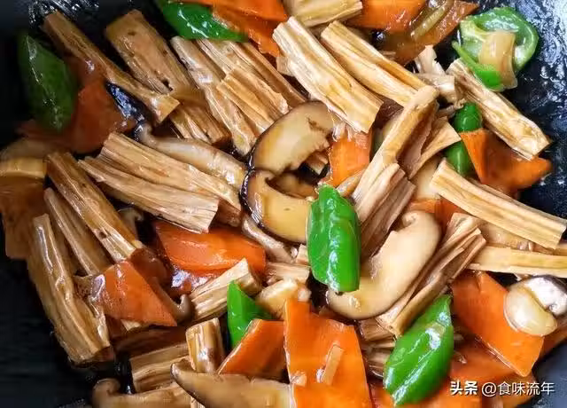 加入泡發好的腐竹和香菇,繼續翻炒。