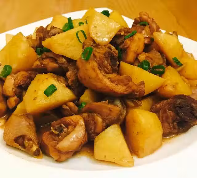 用料:雞肉、土豆、鹽、料酒、蔥、生抽、干辣椒