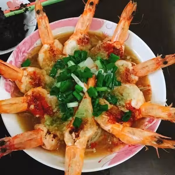 用料:海蝦10隻、綠豆粉絲80克、蒜蓉50克、香蔥碎15克、生抽2大匙、細鹽1/4小匙、砂糖2小匙、白鬍椒粉1/4小匙、高湯(清水)2大匙