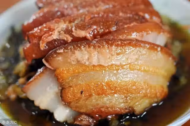 6、湯勺上火燒開,用濕澱粉15克(澱粉8克加水)勾芡,加味精,淋入明油,澆在盤內扣肉上即成。