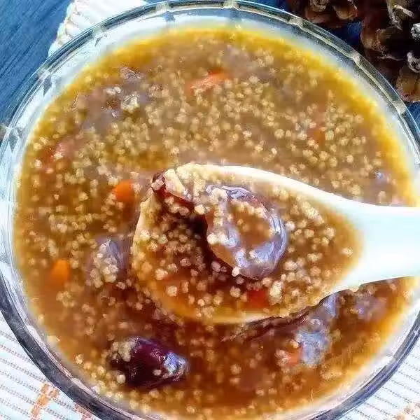 做法: 小米清洗後浸泡30分鐘;紅棗洗凈、去核、切小片;將準備好的小米和紅棗放入鍋中,倒入適量清水,大火燒開後轉小火慢慢熬煮1小時;待粥煮至粘稠,用勺子不停翻攪,避免糊鍋;出鍋前10分鐘加入少許紅糖融化到粥里即可。