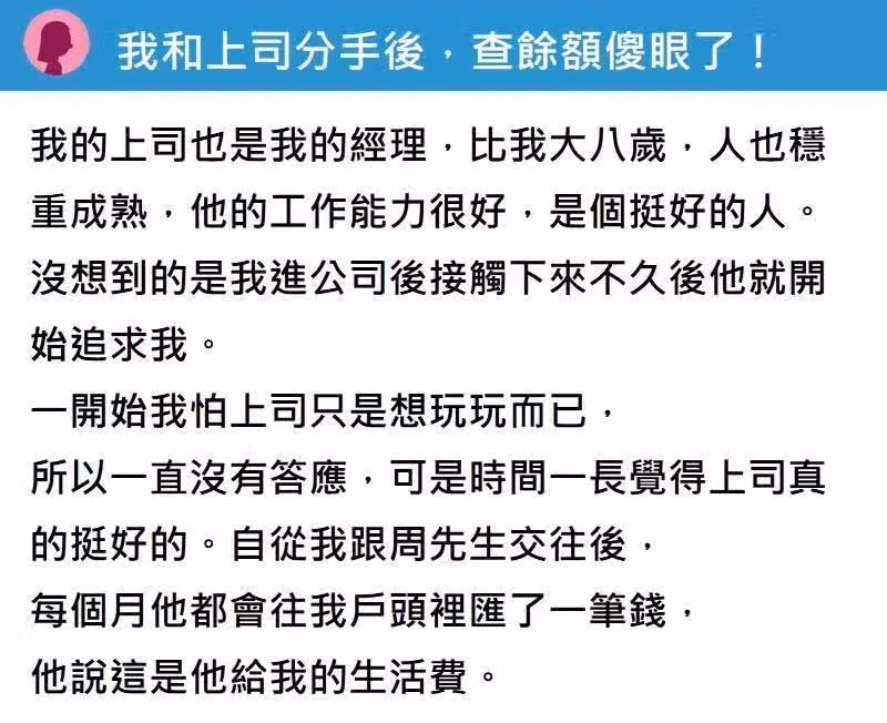 和大8歲上司交往,他每月給我生活費持續了有1年多,直到分手後我一查餘額,當場傻眼了