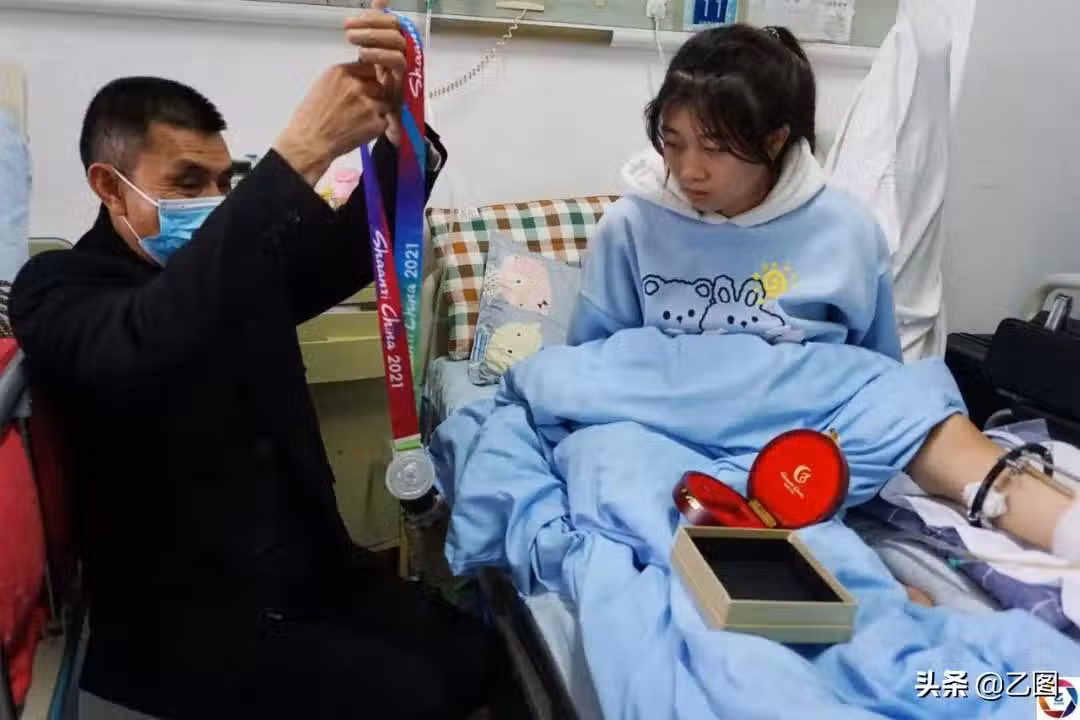 韓付平看著兩個孩子心痛不已,借了一筆錢將侄子送到昭通精神中心治療。就在侄子治療2年後,這個家居然接二連三地迎來了天大的喜事,2020年女兒韓由香被選進陝西省殘疾人皮划艇運動隊,經過了長期辛苦的訓練後,韓由香斬獲了很多的獎項,還在全國殘運會上獲得了銀牌。除了斬獲獎項外還有一個喜事,隊醫告訴韓付平她的女兒可以手術康復的。圖為韓付平在看女兒獲得的獎牌。