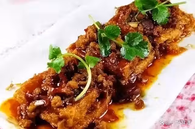 3.鍋留底油,下入郫縣豆瓣醬,小火炒出紅油,加入肉餡,煸炒至變色,再加入蔥姜蒜炒香,烹入料酒,加入白糖、醬油、香醋、鹽和適量清湯,燒2分鐘左右,勾入薄芡,燒至湯汁濃稠,澆在炸好的脆皮豆腐上,美味即成。