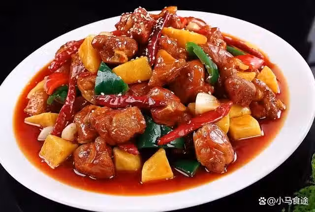 1.處理乾淨的雞肉剁成塊,處理乾淨的土豆切成滾刀塊,青紅辣椒去蒂,改刀切成滾刀塊。