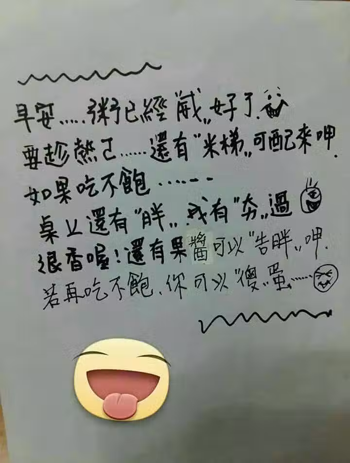 如果上面題目太簡單,一定要來挑戰下面這張留言!用簽字筆手寫的紙條寫著:「早安…粥已經『威』好了,要趁熱喔…還有『米梯』可配來呷。如果吃不飽…桌上還有『胖』,我有『夯』過,很香喔!還有果醬可以『告胖』呷。若再吃不飽,你可以『傻』蛋……」。這段國語台語夾雜的留言裡,出現了6種食物及烹調方式的台語用詞,你看得懂全文嗎?