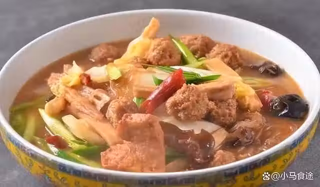 2.起鍋燒油,下入瘦肉片炒變色,加點胡椒粉炒勻,下入圓蔥片翻炒出香,放入西紅柿,炒出汁,放入土豆塊和茄子塊,添入與食材持平的清湯,大火燒開,轉至中小火,燉至土豆軟爛,放入青椒片、炸好的丸子、水發木耳,稍燉片刻,調入鹽和雞粉,即可出鍋裝盤。