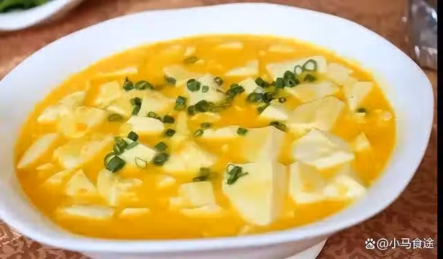 3.起鍋燒油,倒入鹹鴨蛋黃,小火炒至起沙,下入豆腐,適量清水,推勻,簡單調入基本味,淋入水澱粉,再推幾下,加入蔥花,即可出鍋。