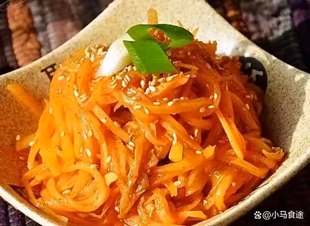 2.起鍋燒油,炒香泡菜絲,加入一勺韓國辣醬繼續翻炒,加入土豆絲翻炒片刻,加入一些韓國泡菜汁翻炒,再加入蔥段和蒜末翻炒片刻,加入醬油,少許白糖,淋入少許香油翻炒均勻,即可出鍋盛入盤中,撒上熟芝麻即可。