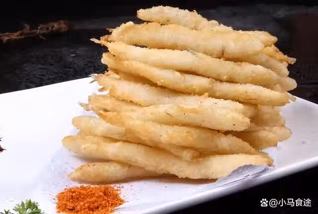 2.起鍋燒油,油溫五成熱,下入魚柳炸至定型撈出,油溫升高再次下入魚柳,炸至表皮酥脆,撈出裝盤,配點麻辣撒料,即可享用。
