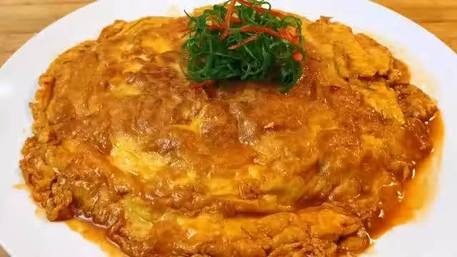 4.鍋留底油,倒入一半的雞蛋液煎至半定型,將滑好的裡脊倒在上面,再將另外一半的蛋液倒在裡脊上,來一個大翻勺,將雞蛋翻至另一面繼續煎制,沿著鍋邊倒入碗汁,收汁入味,即可出鍋裝盤。