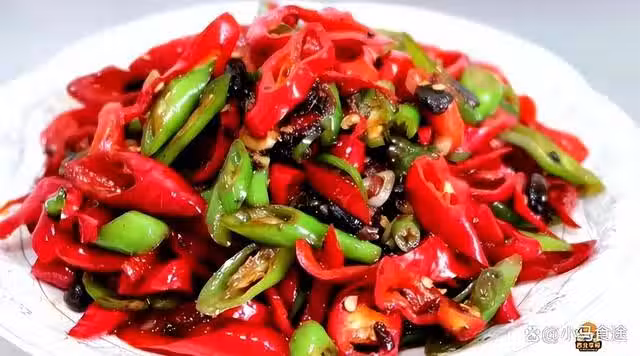 2.起鍋燒油,下入豆豉和拍碎的蒜末爆香,下入紅綠尖椒,翻炒出香,調入鹽、醬油、雞精、味精、少許十三香,少許白糖,少許香醋,翻炒入味,即可出鍋裝盤。