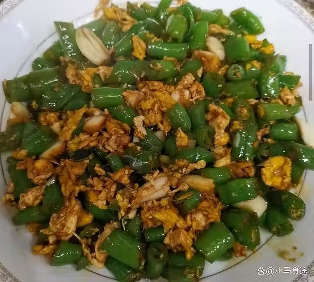 3.再起鍋燒油,下入拍蒜和豆豉,下入尖椒,撒點鹽,煸炒出香,炒至稍微有點虎皮,調入醬油、蚝油、少許白糖,翻炒均勻,下入雞蛋,充分炒勻,即可出鍋裝盤。