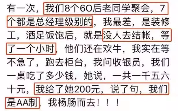 他的那些同學倒是事業有成,參加聚會的7個同學都是老總,他們一起在飯桌上相互吹捧,互相吹牛,吃了好長時間了都沒人去結帳,他實在是等不及了就自己去前台結帳,問前台一共花了多少錢,前台說一共是1560元的,他給了200元,說他們是AA制就離開了。