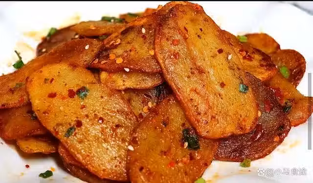 麻辣土豆片,清脆爽口,麻辣味濃,下飯下酒,土豆只需要切薄片,再過一下油,拌上燒烤料中的麻辣味,色澤紅潤,特別誘人。