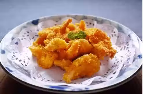 4)麵粉加水和糊,捏住蝦的尾巴把蝦蘸好麵糊,下油鍋炸制,一手捏住蝦的尾巴,一手用鍋鏟往蝦身上撩油。炸好後把蝦擺盤