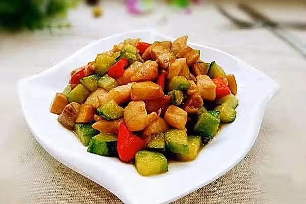 用料:黃瓜一根(120克)、杏鮑菇80克、紅椒半個(不辣的)、雞丁100克