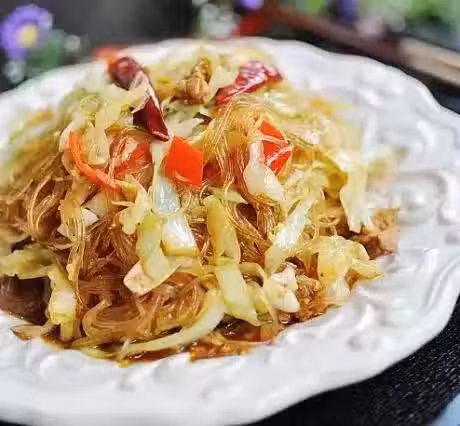 4、當變軟出水時,下粉絲翻炒,放鹽,讓粉絲充分吸收炒出的水分;