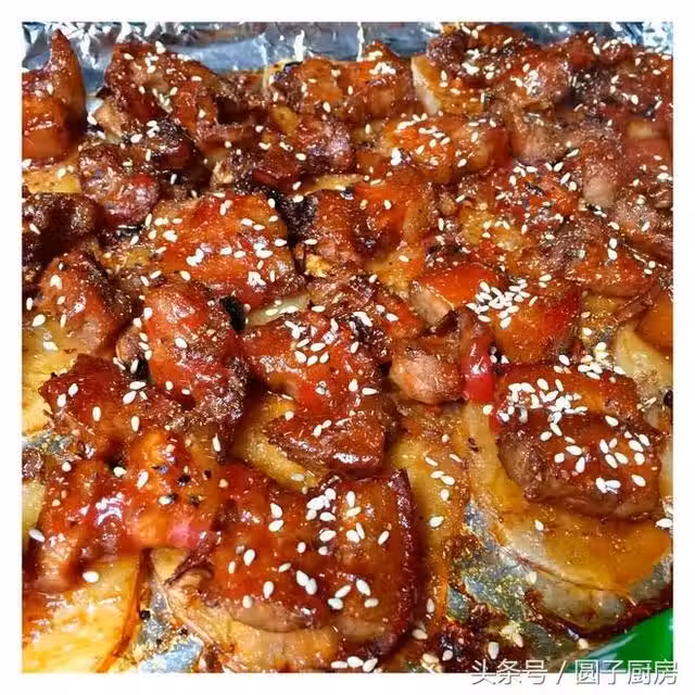 用料:五花肉1斤;土豆1個大大的,或者兩個小的;洋蔥1個;胡蘿蔔半個;黑胡椒適量;孜然粉適量;料酒兩湯匙;生抽醬油適量;老抽醬油適量;鹽適量;生粉適量;老乾媽一湯匙;辣椒粉吃辣就放,我的沒有放;薑末適量;番茄醬適量;食用油適量;芝麻適量;