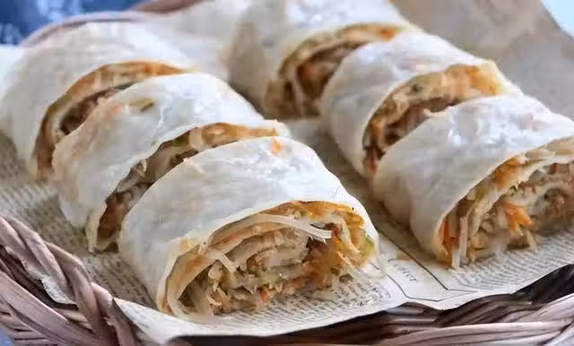 用豆芽、胡蘿蔔、土豆絲、粉絲做成三鮮餡兒,分別處理乾淨,焯水,清炒,湯麵團擀成薄片,鋪上炒的素菜,捲起來,放入蒸籠蒸10分鐘,即可出鍋改刀裝盤。