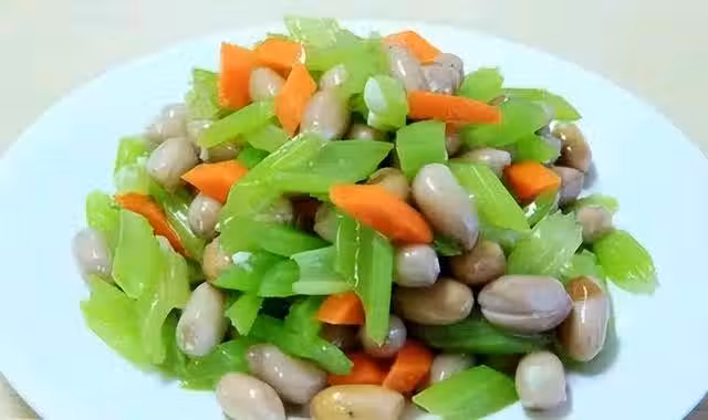 3.胡蘿蔔和芹菜先納入盆中調入鹽、味精、香油攪拌均勻,再加入煮熟的花生米翻拌均勻即可裝入盤中。