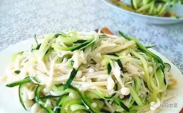 材料:金針菇、黃瓜、青紅椒、鹽、味精、芥末油、香油、生抽、芹菜絲、香醋。