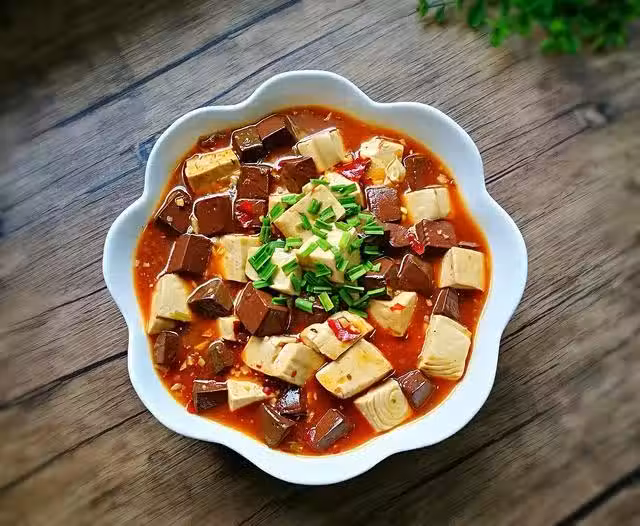 出鍋後,撒一些蒜苗葉。香辣滑嫩的鴛鴦豆腐,用勺子舀著吃才過癮。