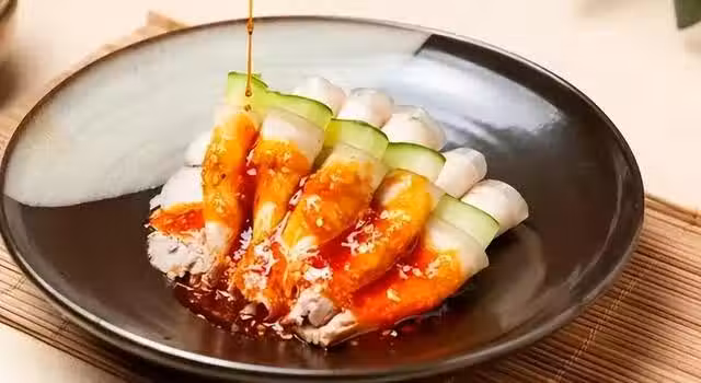 1.豬肉處理乾淨,下入涼水鍋中,加入去腥料,汆煮斷生,撈出冷卻改刀切薄片,黃瓜改刀切薄片。一片白肉裹一片黃瓜,擺入盤中。