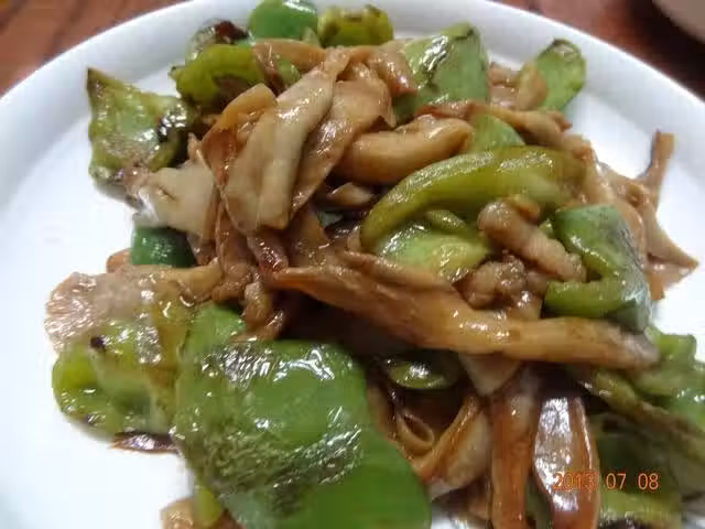 2、炒鍋放適量植物油,放入青椒大火煸炒兩分鐘,放入平菇煸炒,烹入醬油和料酒,適量精鹽,