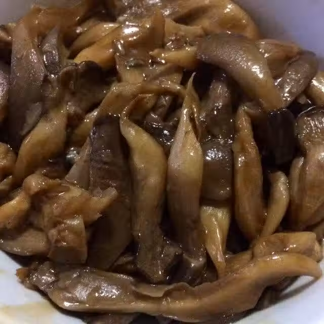 6、關火,等平菇涼一點,放香油,攪拌均勻,盛到瓶子或者碗里。
