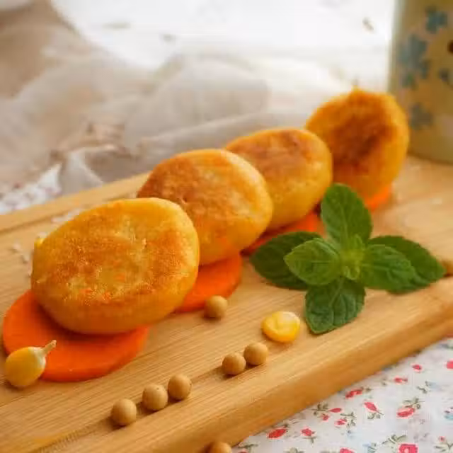 豆渣120克;糯米粉70克;低筋麵粉50克;胡蘿蔔粒15克;細砂糖25克