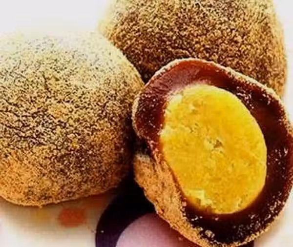 5、依序將作法4的黑糖麻糬皮包入地瓜泥,再沾上少許熟黃豆粉即可。
