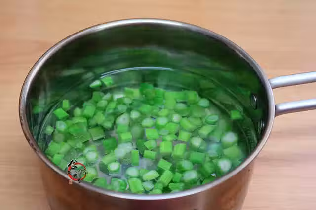 2、燒開適量水,調入3克鹽,將菜心焯熟,撈起瀝干水