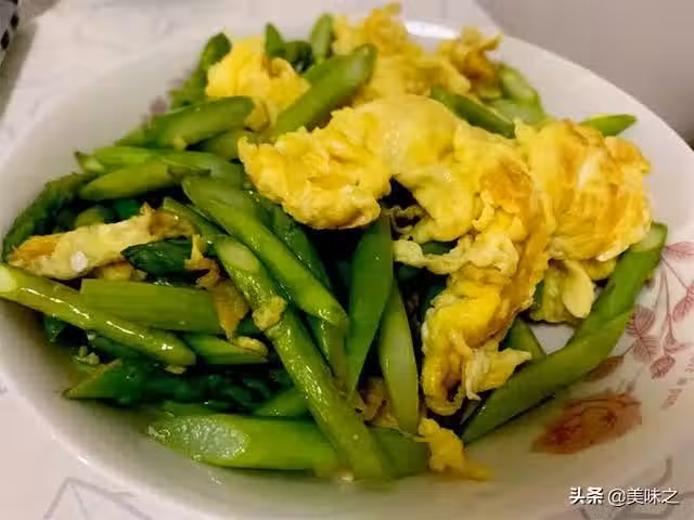 5、雞蛋成形後倒入焯好的蘆筍,放入鹽,雞精,翻炒均勻即可。