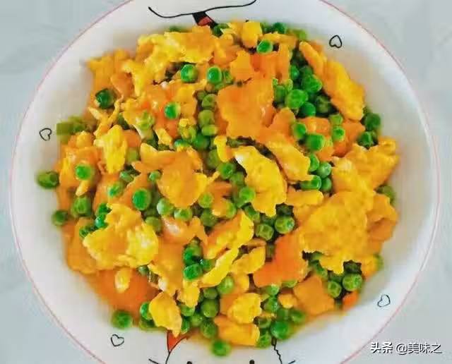 3、平底鍋加熱加點油,炒香蔥花,加黃番茄,加1勺糖,加上焯好的豌豆粒,然後加雞蛋。