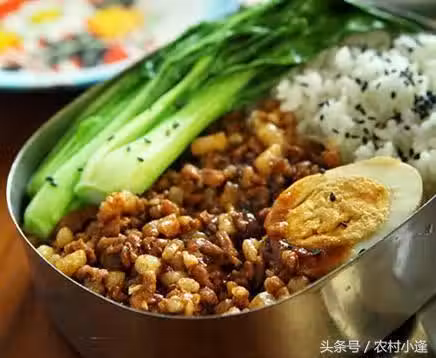 6青菜焯水:青菜洗凈去壞葉,鍋中燒開水放入少量鹽,將青菜放入焯水撈起瀝水。 將上述食材放入容器中,一份香噴噴的滷肉飯就好了喲。