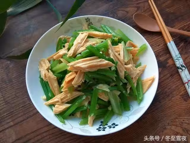 6.將腐竹、芹菜放在盆內,加入蒜末、鹽、香油,將炸好的花椒油淋入盆內,用筷子翻拌均勻即可