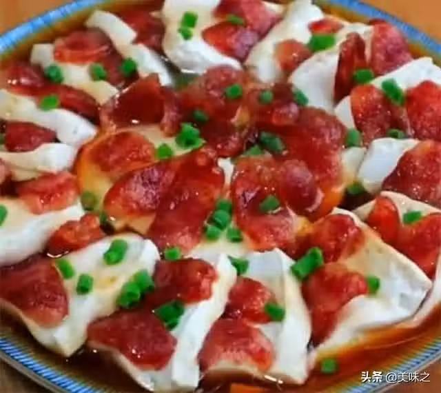 4、蒸熟後撒上蔥花,臘腸蒸豆腐就完成啦。