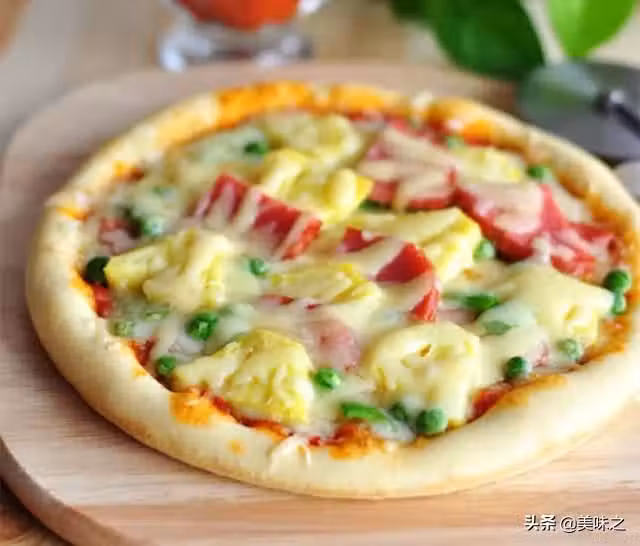 17、依次擺上火腿片、菠蘿片,撒上剩餘的芝士絲,點綴豌豆粒和青椒粒,再入烤箱,原溫度烤8到10分鐘,至表面芝士融化即可。