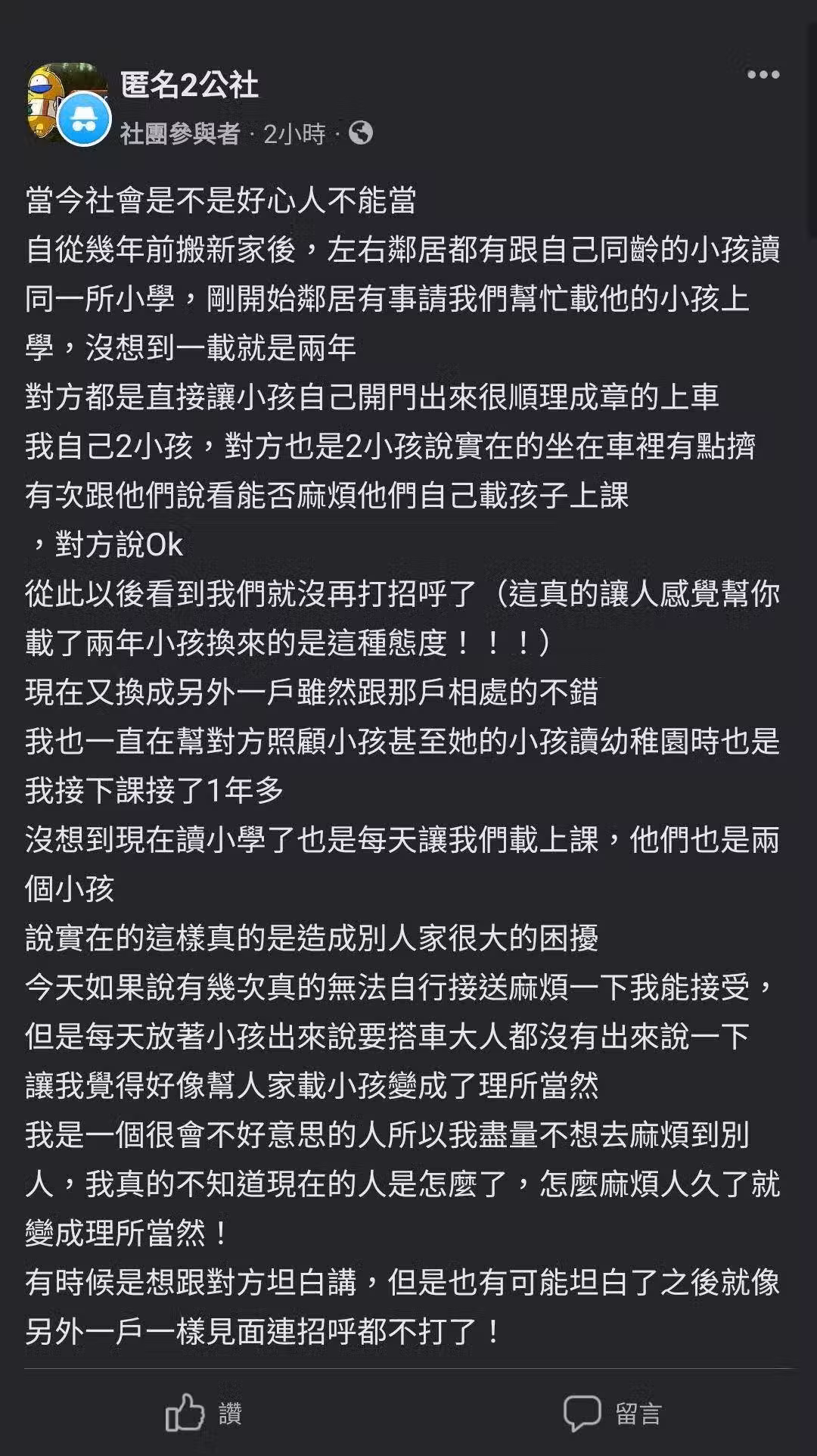 幾年前搬家,一開始鄰居因為有事,請他幫忙載小孩上學,沒想到一載就是2年,每次都很順理成章的上車…某次婉拒對方後,結果大傻眼😔
