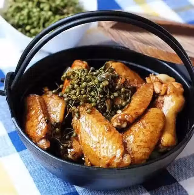 4、雞翅下鍋,用花椒油煎一下,將雞翅本身的油脂慢慢煎出,加入老抽上色;