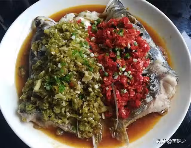 胖頭魚1個、大紅辣椒1個、小紅辣椒10個、泡青辣椒100g、大蒜2顆、姜20g、植物油10g、鹽3g、生抽1勺、蒸魚豉油1勺、料酒50g、香蔥20g、花椒1g、香醋少許。