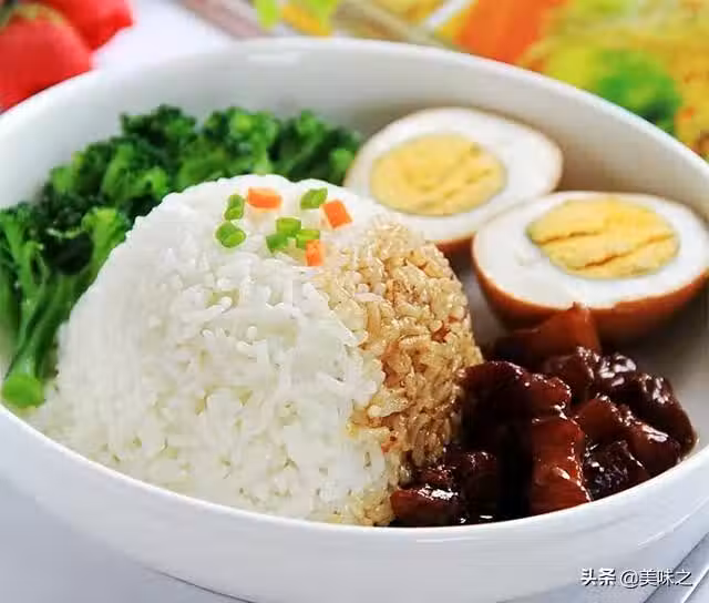 豬肉適量、雞蛋適量、西蘭花適量、米飯適量、食用油適量、鹽適量、老抽適量、蚝油適量、味極鮮醬油適量、冰糖適量、香葉適量、八角適量、桂皮適量、干辣椒適量、薑片適量、沙姜適量、料酒適量。