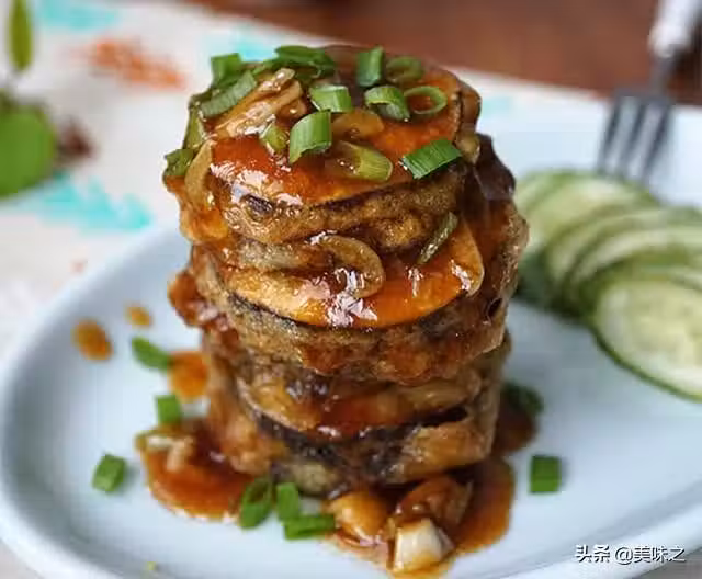 2、茄子橫著切厚片,然後再在中間切一刀不切斷,成為連刀兩片。